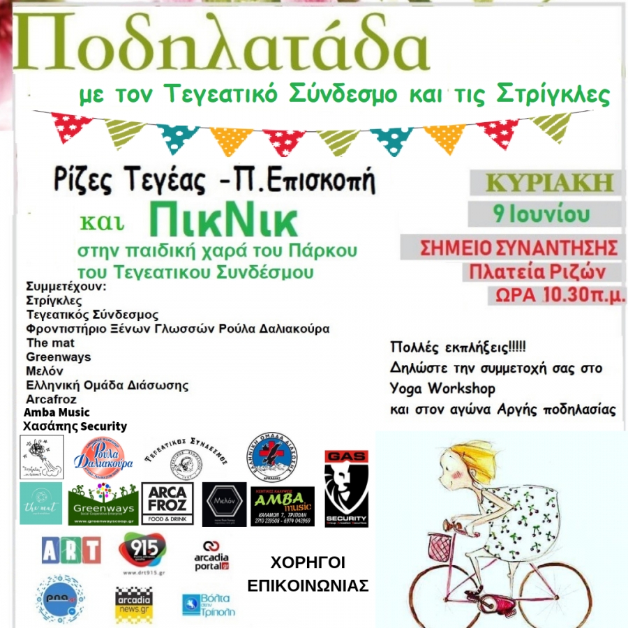 Ο Ε.Ο.Σ. Τρίπολης σας προσκαλεί σε μία όμορφη ποδηλατάδα στην Τεγέα, παρέα με τον Τεγεατικό Σύνδεσμο και τις Στρίγκλες, την Κυριακή 9-6-2019.
