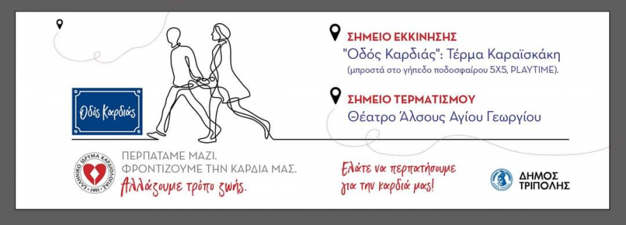 Υπό την αιγίδα του Δήμου Τρίπολης, το Ελληνικό Ίδρυμα Καρδιολογίας, σε συνεργασία με την Καρδιολογική Κλινική του Παναρκαδικού Νοσοκομείου, διοργανώνουν την ενέργεια «ΟΔΟΣ ΚΑΡΔΙΑΣ» στην Τρίπολη, το Σάββατο 4 Ιουνίου, στις 18:00 μ.μ.